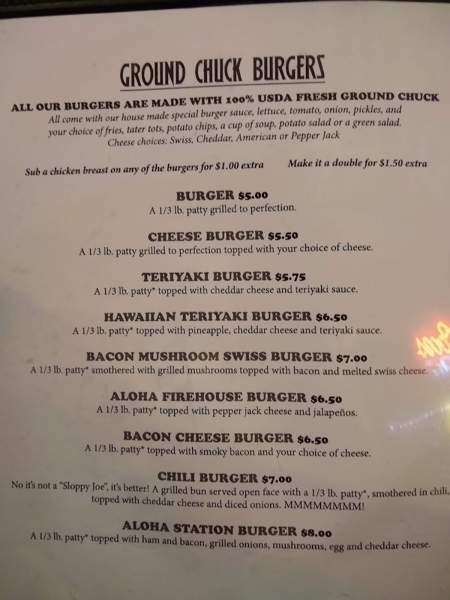 For burger lovers, the selection is vast, including the Hawaiian Teriyaki Burger and the spicy Aloha Firehouse Burger, each crafted from premium ground chuck that promises a juicy bite. Don't forget to indulge in sides like Hash Browns and Chicken Wings, perfect for pairing with friends over a cold brew. With a friendly atmosphere and attentive service, Aloha Station is where delicious food meets a welcoming community.
